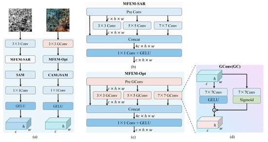 Dual-branch multimodal feature extraction encoder. (a) Dual-branch multimodal feature extraction encoder (DMFEE). (b) Multi-scale feature extraction module (MFEM-SAR). (c) Multi-scale feature extraction module (MFEM-Opt). (d) Gated convolution (GC).