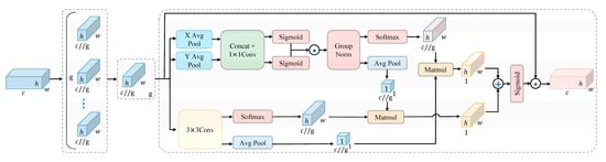 SAM: The spatial attention mechanism is designed as an adaptive region selection strategy that enhances the model’s ability to identify and extract key spatial features from an image. It achieves precise focusing on task-relevant spatial regions by dynamically assigning weights to each spatial position in the feature map. The SAM works as a feature enhancement tool based on pixel-level importance, with the primary goal of optimizing the model’s feature representation by emphasizing semantically important spatial information relevant to the task at hand. As shown in Figure 4, the SAM employs efficient multi-scale attention (EMA) [37] as its core unit. EMA refines the semantic space of features through feature grouping and cross-dimensional interactions, significantly improving the pixel-level semantic information in high-level feature maps. The technical implementation of EMA generates a single-channel spatial attention map with the same spatial dimensions as the input feature map. This attention map assigns differentiated weight coefficients to different spatial regions, enabling the model to focus on the most information-rich areas for the task. The dynamic optimization of feature representation is accomplished by performing element-wise multiplication between the spatial attention map and the input feature map, allowing the model to adaptively focus on significant spatial features.
