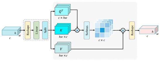CAM: In addition to spatial information, spectral information is significant for cloud removal in cloudy images. Therefore, for the optical branch, we integrate a CAM in parallel with the SAM to effectively enhance and extract spectral information from cloudy images. As shown in Figure 5, inspired by the work of Chen et al. [38], this study employs a multi-head channel self-attention mechanism to capture intricate dependencies across different feature channels. By dividing the feature channels into multiple attention heads, the model can explore inter-channel relationships from different feature subspaces, enabling multi-angle modeling of spectral information. The process is as follows: Given an input feature map , the model generates the query, key, and value matrices through linear transformations. For each attention head, channel attention is calculated using the following formula: