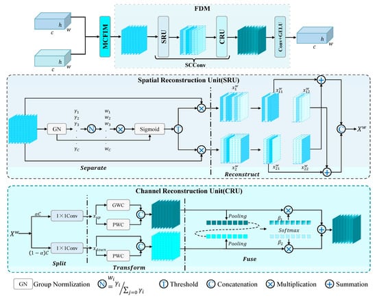 (2) FDM: During the multimodal feature fusion process, the fused feature map inevitably contains redundant information across both the spatial and channel dimensions [41]. This redundancy not only increases the model’s computational complexity but may also introduce potential feature noise. To address this issue, this study applies SCConv to perform redundancy removal on the fused features. SCConv optimizes feature representations and reduces computational overhead through a deep reconstruction mechanism along both the spatial and channel dimensions. As shown in Figure 6, the FDM consists of SCConv, a 1 × 1 convolution, and a GELU activation function. SCConv is responsible for the de-redundancy task, the 1 × 1 convolution adjusts the number of channels in the feature map, and the GELU activation function enhances nonlinear representation. SCConv is composed of two concatenated units: the spatial reconstruction unit (SRU) and the channel reconstruction unit (CRU). The SRU separates and reconstructs features based on their weights to suppress spatial redundancy and enhance feature representation, while the CRU employs a split–transform–fuse strategy to reduce channel-wise information redundancy and optimize computational efficiency. Given an input feature map , the SCConv process can be expressed as follows:
