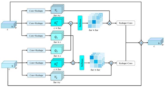 where , , , , , and are projection matrices. Specifically, and undergo matrix multiplication, as do and , to perform the cross-attention calculation: