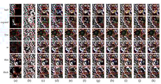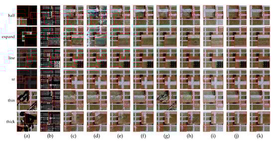 To evaluate the model’s reconstruction performance under different types of missing data scenarios, we designed six different masks for the airborne dataset: half, expand, line, sr, thin, and thick. These masks are intended to simulate data missing at varying degrees and spatial distribution patterns. The simulated corrupted images are shown in Figure 8a and Figure 9a. For example, both the half and line masks result in 50% of the data being missing. In the line mask, there is high spatial autocorrelation between adjacent pixels, enabling the model to extract contextual information, such as spatial structure and texture features, from the unmasked rows. In this case, the model needs to fully utilize the existing prior knowledge from the masked optical image. In the half mask, the model cannot obtain complete spatial structure information from the optical image, making it difficult to accurately infer the specific details of the right half using only the limited prior knowledge from the left half. Thus, the model must rely more on the supplementary information provided by the SAR image, learning optical land features in the missing regions through cross-modal feature transfer. By comparing the model’s reconstruction performance under different masks, we can comprehensively evaluate its robustness and adaptability to various data missingness scenarios.
