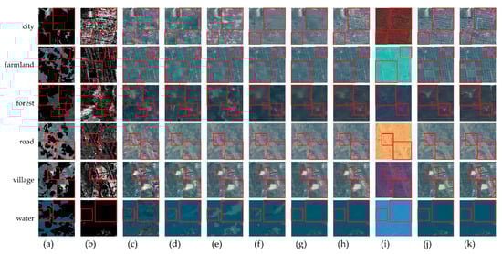 Results on airborne dataset scene 1. The red boxes represent enlarged views of the local regions. The red boxes indicate the enlarged views of the local results. (a) Corrupted image. (b) SAR image. (c) SAR-Opt-cGAN. (d) SpA-GAN. (e) SF-GAN. (f) DSen2-CR. (g) GLF-CR. (h) Cloud-Attention GAN. (i) Conditional diffusion. (j) DMDiff (ours). (k) Cloud-free image.