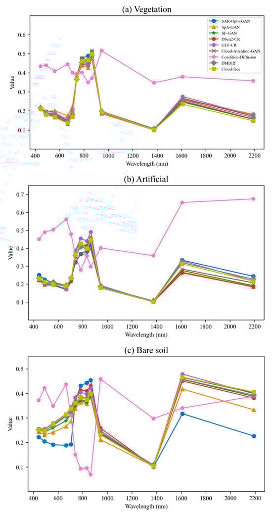 First, we present the reconstruction results for linear features, as shown in Figure 8. SpA-GAN, which uses only optical images, suffers from severe structural deformation, with the repaired regions losing spatial coherence with the cloud-free image, resulting in very low visual consistency. SAR-Opt-cGAN is able to recover the overall linear structure, but the reconstructed result exhibits some texture artifacts, and there are discrepancies in the fine details and texture when compared to the original structure. SF-GAN shows slight improvements in reconstruction quality compared to SAR-Opt-cGAN, but artifacts and loss of detail still persist in the repaired regions. Cloud-Attention GAN also does not completely suppress texture artifacts in the reconstruction. Although DSen2-CR and GLF-CR partially recover the linear structure, the reconstructed regions appear visibly blurred, making it difficult to restore fine image details. Conditional diffusion, based on the iterative denoising strategy of the diffusion model, effectively alleviates the structural distortion problem caused by one-step generation. However, since conditional diffusion relies solely on SAR images as conditional constraints, the reconstructed results show significant spectral differences compared to the cloud-free images, highlighting the limitations of single-source reconstruction methods.