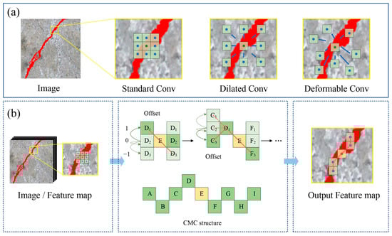 where represents the convolutional kernel weight at point , denotes the complete set of sampling points, iterates over all values in the point set , and represents the learnable offset. Although the learning-based offset has addressed to some extent the issue of the fixed and unchanged receptive field in the same layer of CNN, without constraints, it may lead to the deviation of the receptive field from the target area. Especially in dense and narrow crack areas, problems such as crack extraction interruption and inaccuracy may still exist. The specific structures of standard convolution, dilated convolution, and deformable convolution are shown in Figure 2a.
