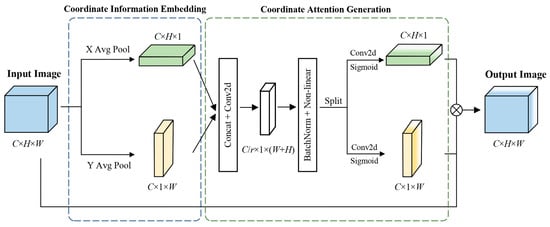 In order to enhance the network’s attention to crack regions, reduce interference from background noise to a greater extent, and avoid increased computational costs, Coordinate Attention embeds positional information into channel attention, thereby reducing computational resource utilization and improving efficiency [29]. Furthermore, this attention module aggregates features along both the vertical and horizontal directions, effectively capturing long-range dependency relationships in the feature map. For tasks involving the extraction of cracks exhibiting linear tubular structures, this approach demonstrates higher feature extraction efficiency and greater accuracy.
