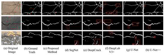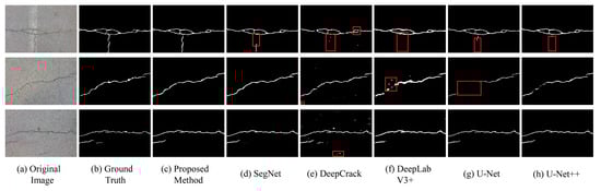 Visualization results obtained by various methods on DeepCrack dataset. Areas that have not been detected or that have been incorrectly detected are marked with red boxes.