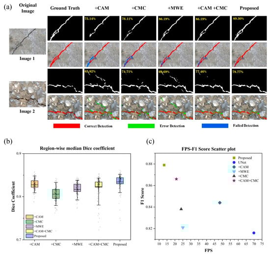 As shown in Figure 8, the comparative images of network prediction results in ablation simulations, the regional median Dice index, and the FPS-F1 score scatter plot are presented. In the comparative images of the prediction results, red markings indicate correctly predicted crack pixels, green markings denote erroneously predicted crack pixels, and blue markings represent crack pixels that are not successfully predicted. As shown in Table 4, the results of the crack prediction accuracy evaluation are presented. Combining the results in the figures and tables, a comprehensive analysis can be conducted, yielding the following: For the baseline network without adding any modules, the accuracy of the crack prediction results is at the lowest level, with mIoU at only 83.8% and F1 at only 81.6%. Adding CAM to the baseline network individually increases F1 by 2.8%. This is because the attention mechanism enhances effective spatial information in the image, improving the network’s noise resistance. Adding the CMC module individually to the baseline network increases F1 by 2.2%. This is because the convolutional structure in this paper effectively adapts to tubular and multi-morphological crack structures through constrained learning offsets, extracting more features of crack pixels. Adding the MWE module individually to the baseline network increases F1 by 0.5%. This is because the multi-scale wavelet enhancement structure effectively supplements the frequency information lost during the downsampling process. Combining the CAM and CMC modules and adding them to the baseline network increases F1 by 5%. Combining CAM, CMC, and MWE in the baseline network results in an effective improvement of 6.3% in F1, achieving the highest scores in Precision, mIoU, and F1. From the ablation results, it is evident that the addition of the three modules is beneficial for improving the performance of the network. The combination of these modules, especially when all three are added simultaneously, helps the network achieve the best crack prediction results. The visualized results in the figures also indicate that the final constructed network presents the optimal visual effects, with extraction results that are cleaner and more accurate.