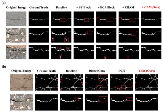 (a) Visualization results of different attention modules on DeepCrack dataset. From left to right, the original image, ground truth, and crack segmentation results of the baseline network, as well as newly added SE Block, ECA Block, CBAM, and CAM (ours) are displayed in sequence. (b) Visualization results of different convolution structures on DeepCrack dataset. From left to right, the crack segmentation results of the original image, ground truth, and baseline network, as well as newly added DilatedConv, DCN, and CMC (ours) are displayed in sequence.
