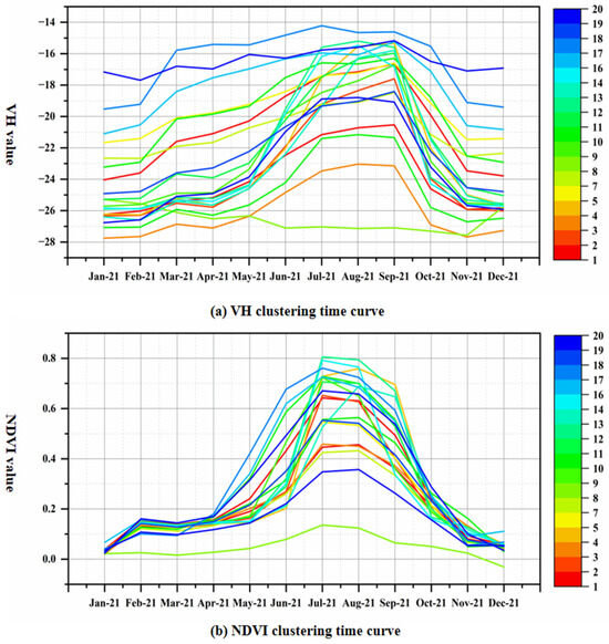 The monthly time series data from Sentinel-1 and Sentinel-2 satellites were processed within the study area throughout 2021. The K-Means clustering algorithm was utilized to perform spatial clustering analysis on the time series data, categorizing them into 20 unique clusters within the study area, as depicted in Figure 3. The final clustering result curves illustrate how the cluster centers evolve during the iterative process and how data points progressively stabilize within specific clusters (Figure 4). The clustering results were interpreted by examining the various vegetation conditions and growth states, as detailed in Table A1 and Table A2. Table A3 integrates the results of the NDVI change analysis (Table A1) with those from the VH band analysis (Table A2), which are combined as different land cover types.