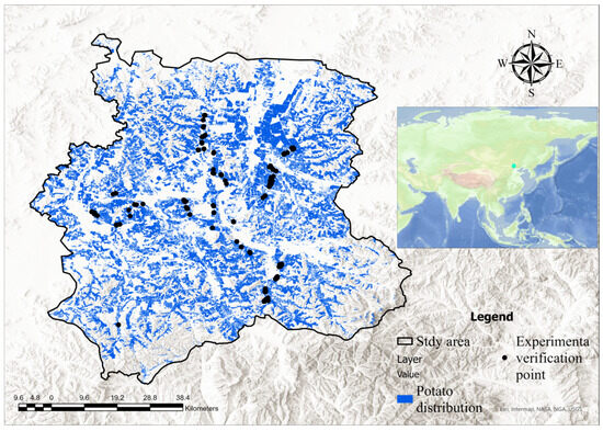 Spatial distribution results of potatoes and their validation performance based on ground data. This map shows the spatial distribution of potato fields identified using the K-Means clustering algorithm and multi-source remote sensing data. The validation performance is assessed by comparing the model’s predictions with ground-truth data collected from field surveys. The results demonstrate the accuracy and reliability of the potato distribution map, highlighting the effectiveness of the proposed method in identifying potato planting areas.