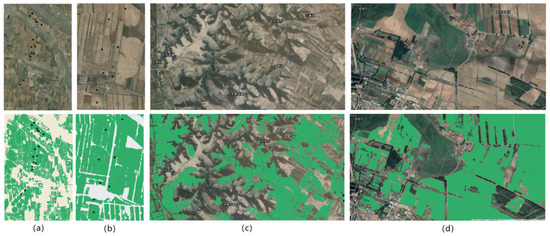 Detailed view of the four scene categories. Figure 6 shows the classification results for four scene categories. It compares actual Google Earth images with model outputs, where green areas indicate potato fields and black dots are ground-measured points. The figure highlights model performance in different landscapes: plains, mountains, and areas with water bodies or towns. (a) (low resolution) shows overall field distribution, while (b) (high resolution) identifies smaller fields. In (c) (mountains), errors are mainly due to shadows. (d) (towns and water bodies) shows good distinction between water and vegetation, though some fragmentation remains.