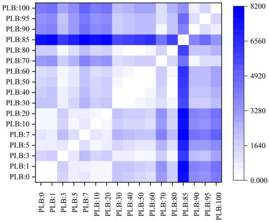 PLB separability results based on Euclidean distance. This figure illustrates the separability of different PLB severity levels using Euclidean distance calculated from Sentinel-2 spectral bands. The labels “PLB: 0” to “PLB: 100” represent the severity levels of the disease, with “PLB: 0” indicating no disease symptoms and “PLB: 100” indicating complete wilting or the most severe form of the disease. These levels are based on the field assessment of disease severity, where higher values correspond to more severe infection. The heatmap shows the spectral differences between these severity levels, helping to evaluate how well the remote sensing data can distinguish between varying degrees of PLB.