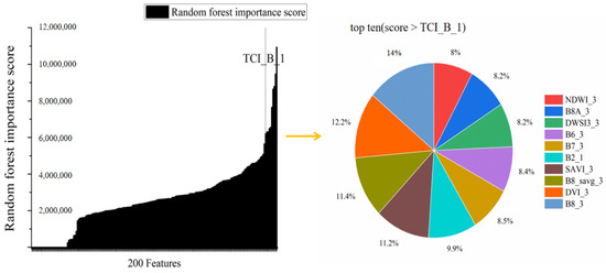 Feature Importance Chart by Random Forest (top ten). This figure illustrates the distribution of importance scores for the 200 features in the MSTS–RF model. The features are ranked in descending order of importance scores, with the TCI_B_1 (blue-channel true-color image synthesized in June) feature ranking 11th in terms of importance score. The pie chart analyzes in detail the relative importance of the top ten features with scores higher than TCI_B_1. The 200 features that trained the model cover a wide range of types, including optical bands, radar bands, quality control and mask features, as well as synthetic and texture features, and are organized into time series.