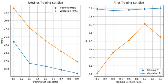 To intuitively evaluate the performance of the selected optimal model under different training set sizes and prevent overfitting, we generated learning curves by randomly selecting samples of varying proportions from the original data to form training and validation sets. We tested several ratios, including 90% training and 10% validation, 70% training and 30% validation, 50% training and 50% validation, 30% training and 70% validation, and 10% training and 90% validation. For each ratio, the raw data were divided into training and validation sets, and the selected optimal model was trained on each training set size. We then calculated the performance metrics—root mean square error (RMSE) and coefficient of determination (R2)—for both the training and validation sets. RMSE measures the difference between the model’s predicted values and the actual values, while R2 indicates how well the model fits the data. Using Python 3, we plotted learning curves with the number of training samples on the horizontal axis and the performance metrics (RMSE and R2) on the vertical axis, drawing separate curves for the training and validation sets.