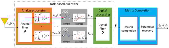 In a pulse–Doppler radar system, the primary task is to recover the delay–Doppler parameters and the amplitudes of targets, which is equivalent to recovering the matrix in (6). Furthermore, because the dimensional matrix is characterized by target parameters , we demonstrate in the next section that is inherently a low-rank matrix. As a result, it is sufficient to recover only a subset of the elements in , rather than reconstructing every individual element as in matrix completion techniques. To optimize resource usage in recovering from the recovered signals, we combine matrix completion with task-based quantization to develop a novel pulse–Doppler radar receiver architecture, referred to as the task-based quantizer via matrix completion (TBQ-MC) architecture.