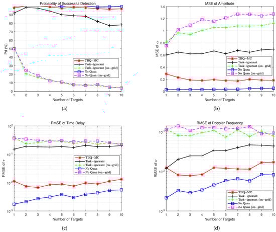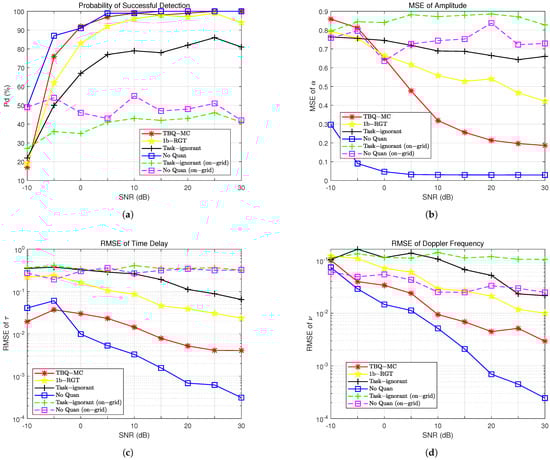 As illustrated in Figure 3a, the probability of successful detection for both the TBQ-MC method and the “No Quan” method remains nearly constant as the number of targets increases, with both achieving near-perfect detection rates. In contrast, the detection performance of the “Task-ignorant” method degrades significantly as the number of targets increases. Moreover, the two on-grid methods fail to resolve the targets effectively as the number of targets grows. This is primarily due to the significant impact of grid mismatch on target detection, especially when dealing with a large number of targets. The MSE of the amplitude, as shown in Figure 3b, follows the same trend as in Figure 3a, with the TBQ-MC method and the “No Quan” method outperforming the others in terms of amplitude estimation accuracy. The curves in Figure 3c,d indicate that both the “No Quan” and TBQ-MC methods achieve satisfactory accuracy in estimating the time delays and Doppler frequencies. In contrast, the two on-grid recovery methods exhibit significant performance gaps due to grid mismatch.