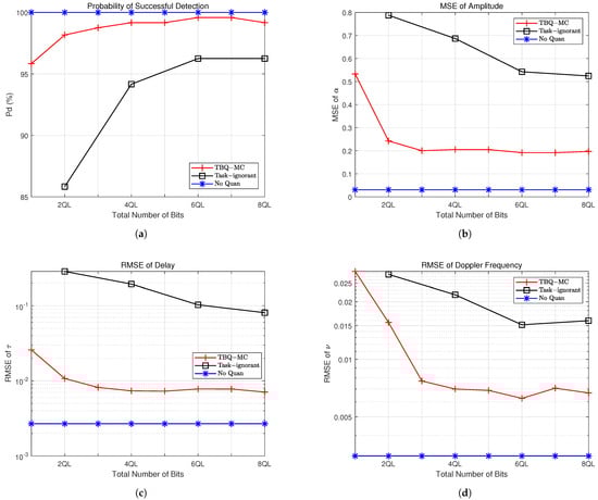 Recovery performance of different methods versus total number of bits (, SNR = 10 dB): (a) successful detection rate, (b) MSE of amplitude , (c) RMSE of time delay , (d) RMSE of Doppler frequency .