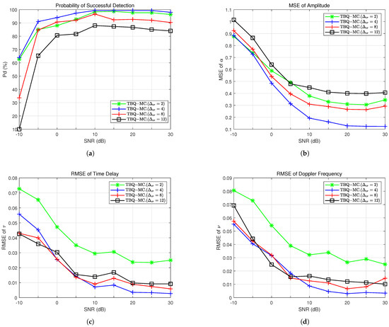 We first evaluate the recovery performance of the six mentioned recovery methods versus the SNR using a given bit budget of . We consider a scenario with target. The compression ratio of TBQ-MC system is set to , with a total number of samples . The probability of successful detection, average MSE of the amplitude, and average RMSE of the delays and Doppler frequencies are shown in Figure 2a–d, respectively.
