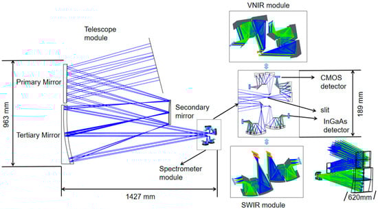 The integrated telescope–spectrometer system ensures seamless imaging and high-performance coast observation. Incoming light is directed through the primary mirror and split into two optical paths by a field splitter: one for the visible-near infrared (VNIR) band and the other for the shortwave infrared (SWIR) band.