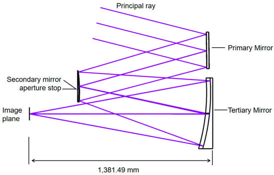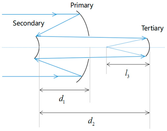 To achieve high-resolution imaging over a wide wavelength range, the telescope system adopts an all-reflective design. A triaxial structure was selected as the initial design, as shown in Figure 2. The object distance is considered to be equivalent at infinity, the vertex curvature radii of the primary mirror, the secondary mirror, and the third mirror are R1, R2, R3, respectively, the center interval of the primary mirror and the secondary mirror is d1, the center interval of the secondary mirror and the third mirror is d2, the center interval of the third mirror to the image surface is l3, and the focal length of the system is f’. The formulas for calculating the size of the structure from the dimension coefficient of the profile are as follows [25]: