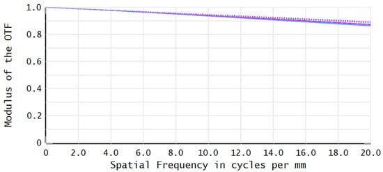 The modulation transfer function (MTF) indicates the system’s ability to retain spatial detail at different wavelengths. The MTF is defined as the ratio of relative image contrast to relative object contrast, and it quantifies the ability of an optical system to retain detail and the response of the system to different spatial frequencies. Achieving >0.85@18.52 lp/mm ensures exceptional imaging quality for both spectral and spatial dimensions, as shown in Figure 4. The root-mean-square (RMS) spot radius is consistently below 6.0 µm, corresponding to less than half a pixel size, as shown in Figure 5. The spot size was quantified using the RMS spot radius, which calculates the RMS radius of the intersection of all the rays to the chief ray. This value is used to quantify the effect of system aberrations. The expression is as follows: