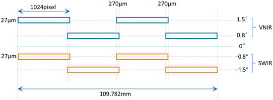 - Application case: In the SWIR channel of the GF-5 satellite’s AHSI payload, four 512 × 512 mercury cadmium telluride (HgCdTe) focal plane detectors are precisely spliced together, resulting in a 2048 × 512 SWIR focal plane detector [19]. This detector splicing method is similarly applied in the long-wave infrared (LWIR) channel of TIRI, a small satellite developed by CASEarth [31].