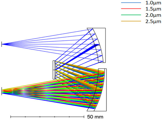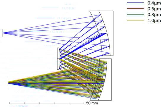 Here, z is the radial height, c is the vertex curvature, k is the conic constant, r is the radial ray coordinate, N is the total number of polynomial coefficients in the series, Ai is the coefficient of extension polynomial, and Ei is Zernike polynomial. Table 3 summarizes the telescope parameters, and the telescope structure is shown in Figure 3. The use of freeform optical surfaces significantly reduces the system’s size and weight compared to traditional optical systems. This compact design improves performance by enabling higher spatial resolution and a wider field of view, which are critical for high precision coast monitoring. Freeform optics also offer greater flexibility in optimizing the trade-off between spectral coverage and spatial resolution, thus meeting the stringent requirements for a wide field of view, high resolution, and high signal-to-noise ratio imaging [27,28]. This feature is especially beneficial for applications in dynamic coast monitoring and underwater target detection.