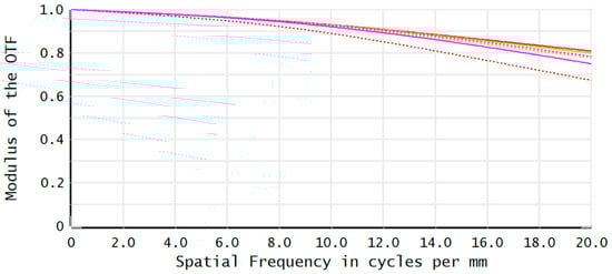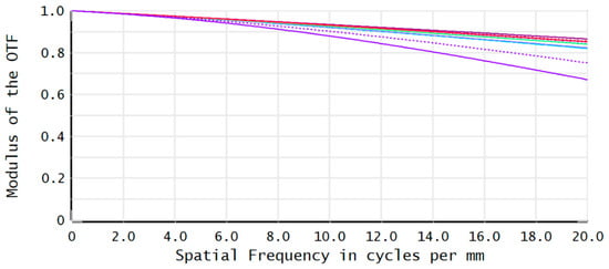 As illustrated in Figure 17, the high-resolution coast observation payload has been successfully simulated. Figure 18 presents the modulation transfer function (MTF) curves across different wavelengths. At the Nyquist frequency of 18.52 lp/mm, the MTF exceeds 0.68 for all observed wavelengths, demonstrating exceptional image quality and spectral fidelity.