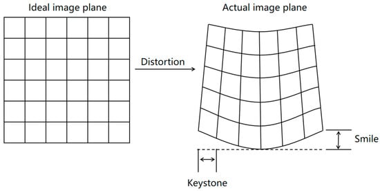 Smile and keystone distortions are common optical aberrations in spectral imagers that significantly affect image geometry, especially during spectral scanning. Smile distortion manifests as a spectral shift of the sensor across the entire field of view (FOV), causing spectral misalignment and potentially degrading spectral calibration accuracy. This distortion often results in a curved shape when spectral lines are viewed along the detector array. Keystone distortion appears as a spatial misalignment between different spectral bands, leading to geometric inconsistencies across the spectral axis. This misalignment may cause difficulties in accurately registering multi-band images and disrupt spatial continuity.