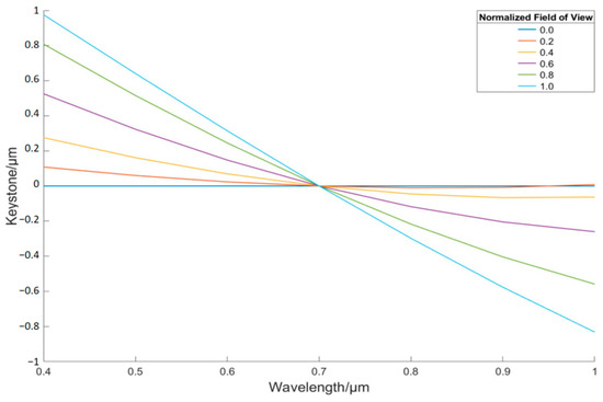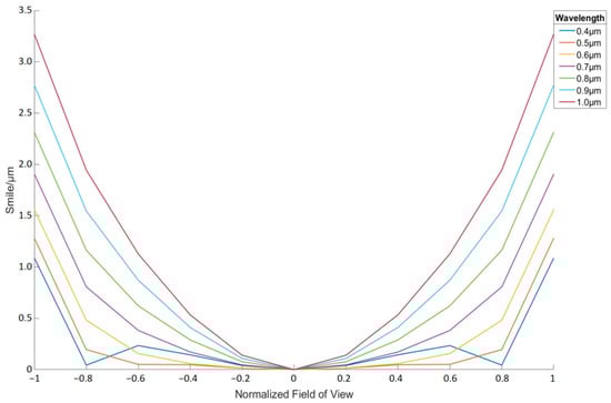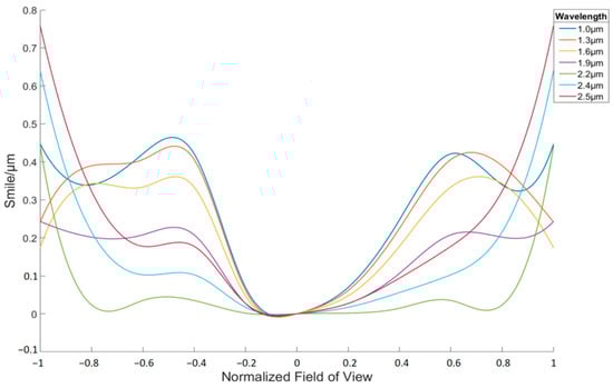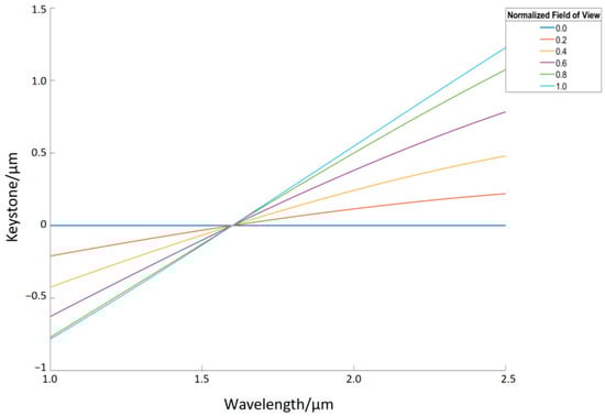 As shown in Figure 12 and Figure 13, the maximum spectral smile distortion was measured at 3.27 μm, while the maximum keystone distortion was observed at 0.98 μm in the VNIR band. Similarly, as depicted in Figure 14 and Figure 15, the maximum spectral smile distortion in the SWIR band was measured at 1.6 μm, with the maximum keystone distortion occurring at 0.76 μm. These results underscore the system’s ability to maintain high-fidelity spectral imaging across both the VNIR and SWIR bands, demonstrating effective optical design and distortion control. The precise characterization of these distortions provides valuable insights for calibration strategies, ensuring improved spectral accuracy and geometric integrity in hyperspectral imaging applications.