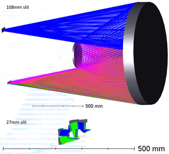 - Kwo, D.; Lawrence, G.; Chrisp, M. Design of a Grating Spectrometer from a 1:1 Offner Mirror System. In Proceedings of the 31st Annual Technical Symposium on Optical and Optoelectronic Applied Sciences and Engineering, San Diego, CA, USA, 17–21 August 1987; Volume 818, pp. 275–279. [Google Scholar]