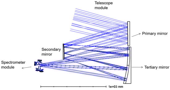 In this paper, a system simulation analysis is carried out on the basis of the existing detectors, illustrated in Figure 1, which operates in a line-scan pushbroom mode, covering a spectral range of 0.4–2.5 µm. The system achieves a cross-track field of view of 9.16° and a spatial resolution of 20 m at an orbital altitude of 500 km. It collects hyperspectral data over an 80 km swath, with an off-axis F/2.75 three-mirror anastigmatic telescope featuring freeform surfaces and an effective diameter of 245 mm. The optical path is divided into visible-near-infrared (VNIR) and shortwave infrared (SWIR) channels through a field-of-view separator. Two channels are integrated into long-slit Offner convex-grating spectrometer modules and coupled with CMOS and HgCdTe detectors. The VNIR band consists of four 1024 × 256-pixel, 27 µm detectors, and is the same as the SWIR bands. The payload is compact, with dimensions of 1427 × 963 × 620 mm3. Table 2 summarizes the key characteristics of this advanced hyperspectral imaging system.
