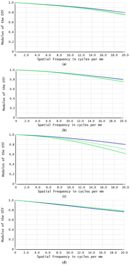MTF diagram at different wavelengths: (a) 400 nm; (b) 900 nm; (c) 1100 nm; and (d) 2500 nm.