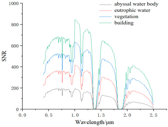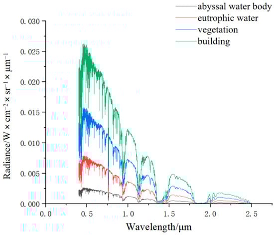 To verify the capability of the system in coastal observation, we selected several typical coastal materials as test subjects, including an abyssal water body, eutrophic water (e.g., algal blooms), vegetation, and buildings. Their surface albedos were 0.05, 0.15, 0.3, and 0.5, respectively. The radiance received by the imaging spectrometer at orbital altitude under typical atmospheric conditions was simulated using Modran 5.0 version. The simulation parameters are provided in Table 7 and final simulation results are shown in Figure 19.