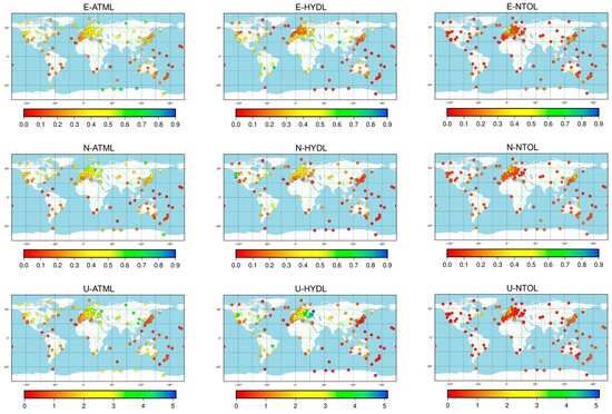 Figure 2, the effects of environmental loads such as ATML, HYDL, and NTOL are related to station locations, with particularly pronounced deformation effects observed in the up components.