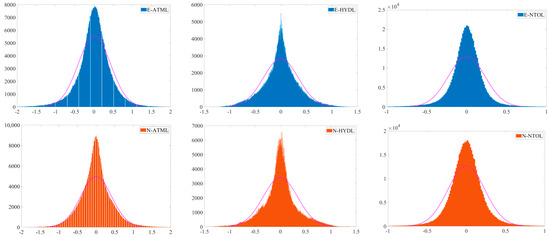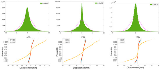 Figure 3 shows the normal distributions and normalization of data for 186 global GNSS stations in the E, N, and U directions under the effects of ATML, HYDL, and NTOL. Each direction’s distribution closely follows a normal distribution, as evidenced by the Gaussian fits shown in pink, suggesting that the majority of displacement values are centered around zero. However, the magnitudes of displacement differ significantly across the three loading types. The atmospheric and hydrological loadings exhibit larger magnitudes of influence compared with non-tidal ocean loading. The cumulative plots reveal that the atmospheric and hydrological loadings tend to cause more extreme displacement values (both positive and negative) in the vertical direction (U) compared with the horizontal directions. The non-tidal oceanic loading shows a narrower range of displacement values. Detailed percentages of the normal distribution can be found in