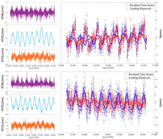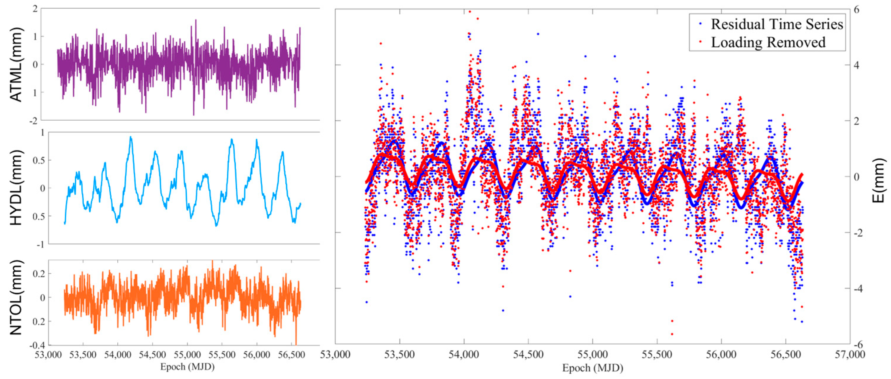 Figure 4 depicts the time series of ATML, HYDL, and NTOL for the three components (E, N, and U) of one station, as well as the residual time series before and after the removal of environmental loading effects. The figures reveal that ATML, HYDL, and NTOL all exhibited distinct periodic characteristics.