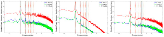 32]. The Lomb–Scargle periodogram method was used to calculate the power spectrum of displacement caused by all environmental loading effects, and then the power spectrum was superimposed according to the three coordinate components of E, N, and U. Next, the results of each component were processed via Gaussian filtering to obtain the displacement stacking power spectrum caused by atmospheric loading, hydrological loading, and non-tidal ocean loading, as shown in