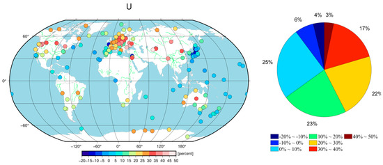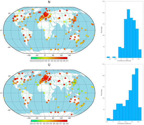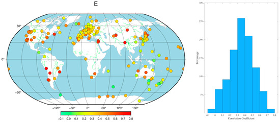 Figure 6, the magnitude of the correlation coefficient varied with the station location. In the E direction, the majority of the stations had correlation coefficients between 0 and 0.5, accounting for approximately 79% of the total number of stations, which were mainly located in Europe and North America. A small number of stations, particularly in East Asia and parts of Europe, had correlation coefficients greater than 0.5. In the N direction, about 77% of the stations had correlation coefficients between 0 and 0.5, with a few stations exhibiting extreme negative correlation values. In the U direction, the correlation coefficients were generally higher, especially in the European region, where the proportion of stations with correlation coefficients greater than 0.5 increased significantly. The statistical results show that approximately 60% of the stations had U direction correlation coefficients greater than 0.5. Overall, the characteristics of the correlation coefficients for the E and N components were similar, yet the overall correlation was lower than that for the U component. These results highlight a significant positive correlation between environmental loading effects and GNSS time series, with environmental loading effects demonstrating stronger explanatory power in vertical nonlinear motion compared with the horizontal component.