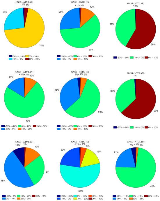 Figure 7 shows RMS percentage change pie charts of the E, N, and U components for 186 GNSS stations after removing the effects of ATML, HYDL, and NTOL environmental loads. Following the removal of the ATML, the RMS decreased in 73.1%, 83.9%, and 90.3% of the stations in the E, N, and U components of the GNSS coordinate time series, respectively, and for removal of the HYDL, the percentages were 73.7%, 63.4%, and 77.4%, respectively. Upon NTOL environmental loading effect correction, the percentages decreased to 58.1%, 62.9%, and 74.2% of the stations in the E, N, and U components, respectively.