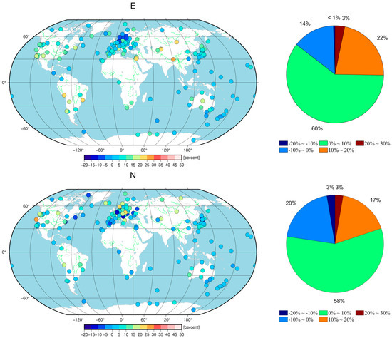 Figure 8, the impact of environmental loading effect correction on the coordinate time series was closely linked to the geographic location of the measurement station. Overall, 85.5%, 77.4%, and 89.8% of the stations exhibited reductions in the RMS in the E, N, and U components, respectively, with average decreases of 6.2%, 4.4%, and 16.7%, indicating that the environmental loading effects had a large contribution to the vertical nonlinear motion but a weak impact on the horizontal displacement.