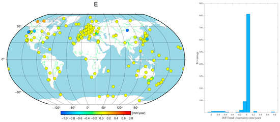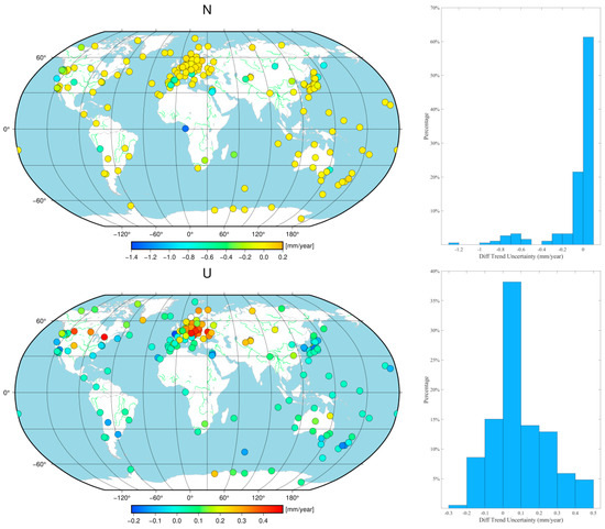 39]. Furthermore, the findings revealed that 82.3%, 58.6%, and 75.8% of the stations experienced a reduction in velocity uncertainty in the E, N, and U components, respectively, following the correction of environmental loading effects. Overall, the correction of environmental loading effects had a significant impact on velocity estimation. Therefore, when establishing a millimeter-level coordinate framework, both environmental loading effect correction and consideration of optimal noise models are crucial factors to be taken into account.