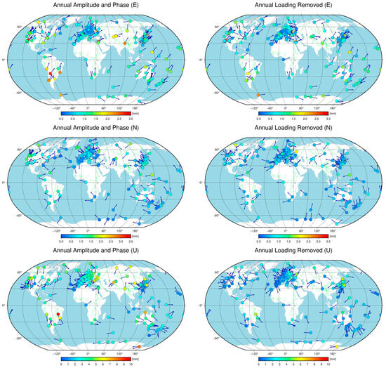 Figure 10. It can be observed that the annual amplitudes in the E, N, and U components for most stations decreased to varying degrees. Specifically, in the E component, the average annual amplitude decreased from 0.98 mm to 0.82 mm, representing a 16.7% decrease. In the N component, the average annual amplitude decreased from 0.76 mm to 0.66 mm, a 12.7% decrease. Notably, in the U component, the average annual amplitude significantly decreased from 3.30 mm to 1.88 mm, indicating a 43.1% decrease. The extent of the change in the station annual amplitudes appeared to be correlated with the stations’ locations, suggesting a match between the locations of environmental loads and the surrounding environments of the stations. The arrows in the figure represent the corresponding phase angles, with most stations showing no significant changes in the annual phase angles. Specifically, the average annual phase changes were 5.6 degrees, 3.1 degrees, and 11.6 degrees in the E, N, and U components, respectively.