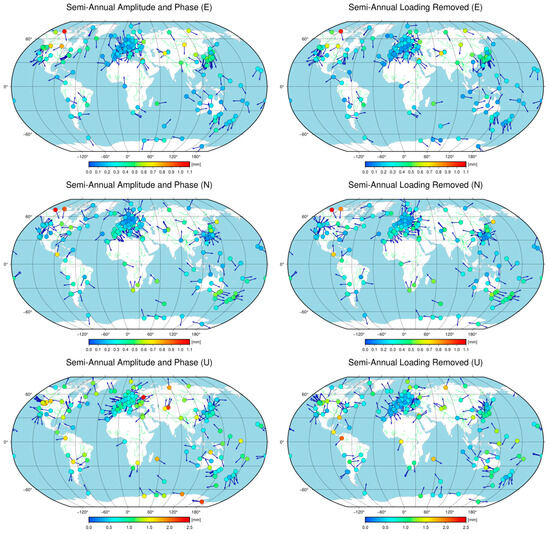 Schematic diagram illustrating the semi-annual amplitude and phase in the E, N, and U components before and after removing environmental loading effects. The legend range is 0.0–1.1 mm for the E and N components and 0.0–2.5 mm for the U component. Arrows indicate the phase angle.