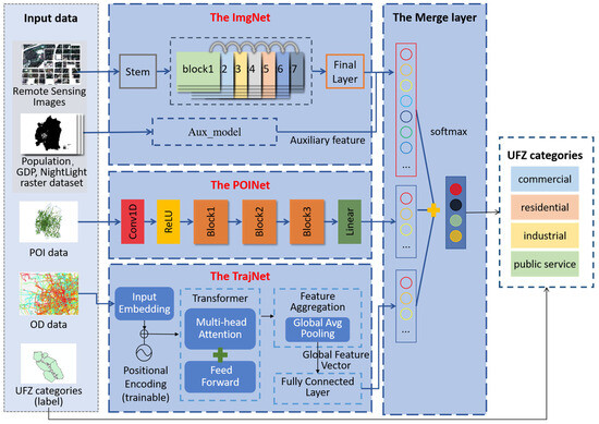 The proposed TriNet framework employed a tripartite neural network architecture designed to process image data, POI data, and OD data independently, enabling precise classification of UFZ categories. The methodological workflow, illustrated in Figure 3, consists of four core components: ImgNet, POINet, TrajNet, and a merge and classification layer.