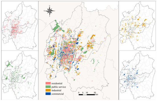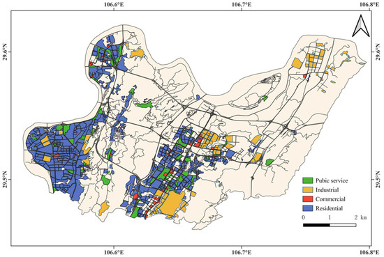 The UFZ categorization system follows the Classification of Urban and Rural Land Use and Planning Standards of Development Land [31] issued by the Ministry of Housing and Urban-Rural Development of China. It classifies UFZs into four main types: residential, commercial, public service, and industrial zones, as shown in Table 1. This classification reflects the core functions of different urban regions, with residential areas focusing on living needs, commercial areas on economic activities, industrial areas on production, and public service areas on services like education and healthcare. The classification system is clear, practical, and highly versatile, suitable for urban planning research.