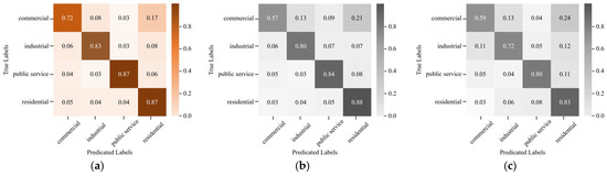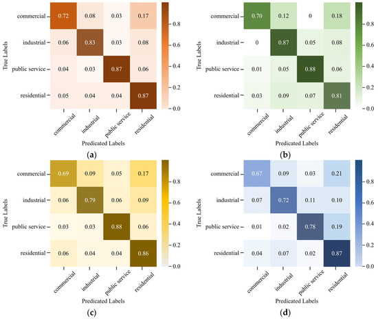 Figure 11b presents the confusion matrix for the three-branch network model based on EfficientNet-V2. Except for the residential area, the classification accuracies for commercial areas, industrial zones, and public service areas all show noticeable declines, particularly the classification of commercial areas, which drops below 60%. Moreover, the probability of misclassifying commercial areas as residential zones rises to 21%, which is the direct cause of the overall decrease in classification accuracy. This decline in performance can be attributed to the relatively lower capability of EfficientNet-V2 in capturing complex spatial patterns compared to EfficientNet-B4. While EfficientNet-V2 is an efficient model, it may not be as well-suited for capturing fine-grained spatial features, especially in urban environments where functional zones exhibit intricate boundaries and overlapping characteristics. The misclassification of commercial areas as residential zones is likely due to the similarities in spatial features, such as building density and infrastructure, that EfficientNet-V2 struggles to differentiate without the finer-grained resolution provided by EfficientNet-B4.