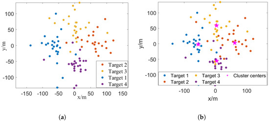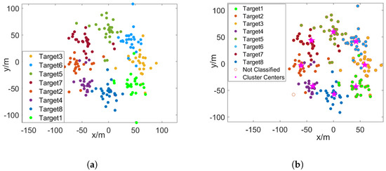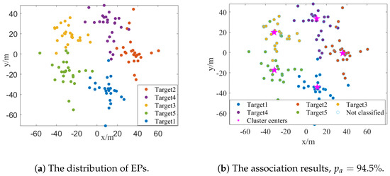 A specific example of the distribution of EPs and the association results in Scenario 1, where SNR = 10 dB, , R = 60 m. (a) The distribution of EPs. (b) The association results in this specific example, where the proposed measurement association method achieves .
