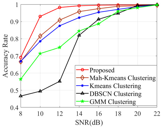In Figure 3, our investigation of the association performance under different SNRs is illustrated. As observed in Figure 3, the proposed method exhibits significantly higher accuracy compared to directly adopting [38,39,40,41]. The results also demonstrate the effectiveness of the utilized distance metric and the designed set of neighboring EPs. Additionally, in Table 2, we present the probability of identifying a normal EP as a false alarm, denoted by , as well as the probability of correctly identifying the number of targets, denoted by , across different SNR levels. It is demonstrated that remains at a very small value and gradually decreases with an increasing SNR. Moreover, the proposed method can accurately identify K under different SNR levels.